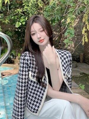 ✅千鳥格子柄ジャケット ノーカラー パールボタン エレガント E466