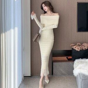 ✅オフショルワンピース フリンジ タイト エレガント お呼ばれ E547