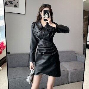 ✅フェイクレザーワンピース ミニ丈 長袖 モード エレガント E549