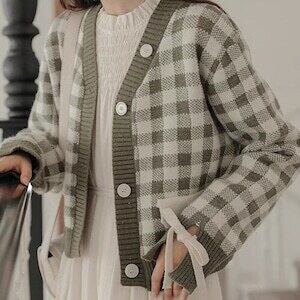 ✅ギンガムチェックカーディガン 袖リボン ニットカーデ ガーリー E635