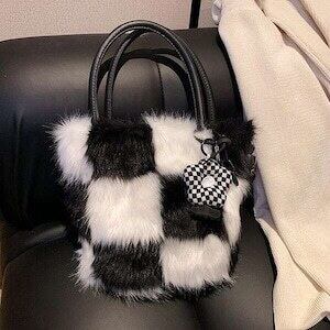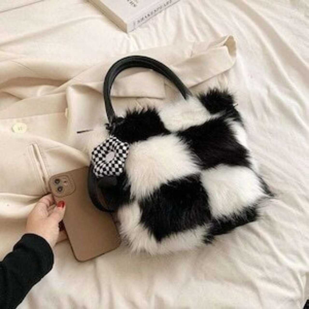 ✅ファーハンドバッグ ブロックチェック柄 ショルダーバッグ カジュアル E581