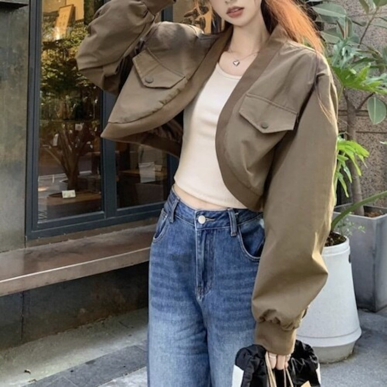 ✅ギャザースリーブカジュアル ガーリーショート丈ブルゾン ジャケット E585