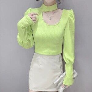 ✅ パフスリーブ チョーカー風トップス リブニットガーリー E653