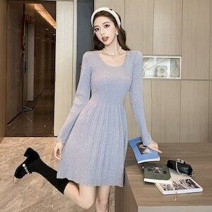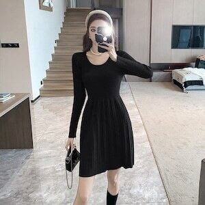 ✅カジュアル ベーシック E548ニットワンピース ミニ丈 ラウンドネック