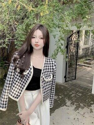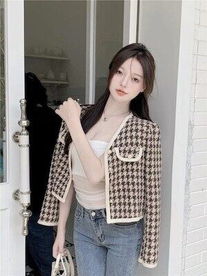 ✅ノーカラー パールボタン エレガント E466千鳥格子柄ジャケット