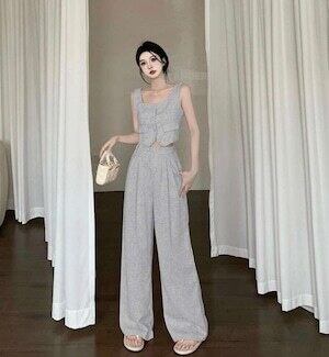 このカジュアルセットアップは、快適さとスタイリッシュさを兼ね備えたアイテムです。ノースリーブトップスは、胸元の切り替えデザインとスリットの入った裾が特徴です。ワイドパンツはリラックス感のあるシルエットで、動きやすさも抜群です。
