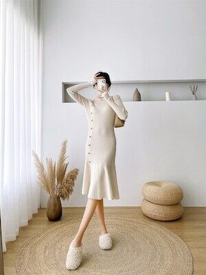 まずはアイテムの特徴をご紹介します。このニットワンピースは、エレガントなマーメイドシルエットが特徴です。ガーリーコーディネートやデートシーンにぴったりな一枚です。女性らしいボディラインを引き立てるよう、ウエストから広がるフレアなデザインになっています。柔らかな素材で肌触りも◎。