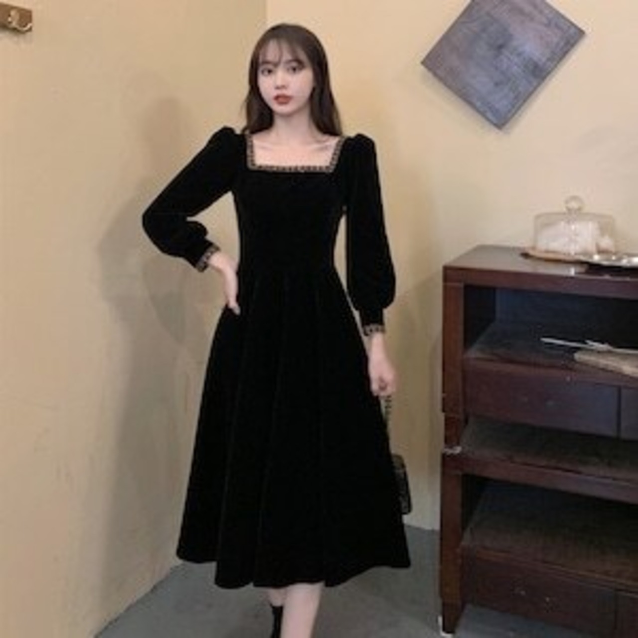 ✅スクエアネックワンピース Aラインスカート レトロ ガーリー E496