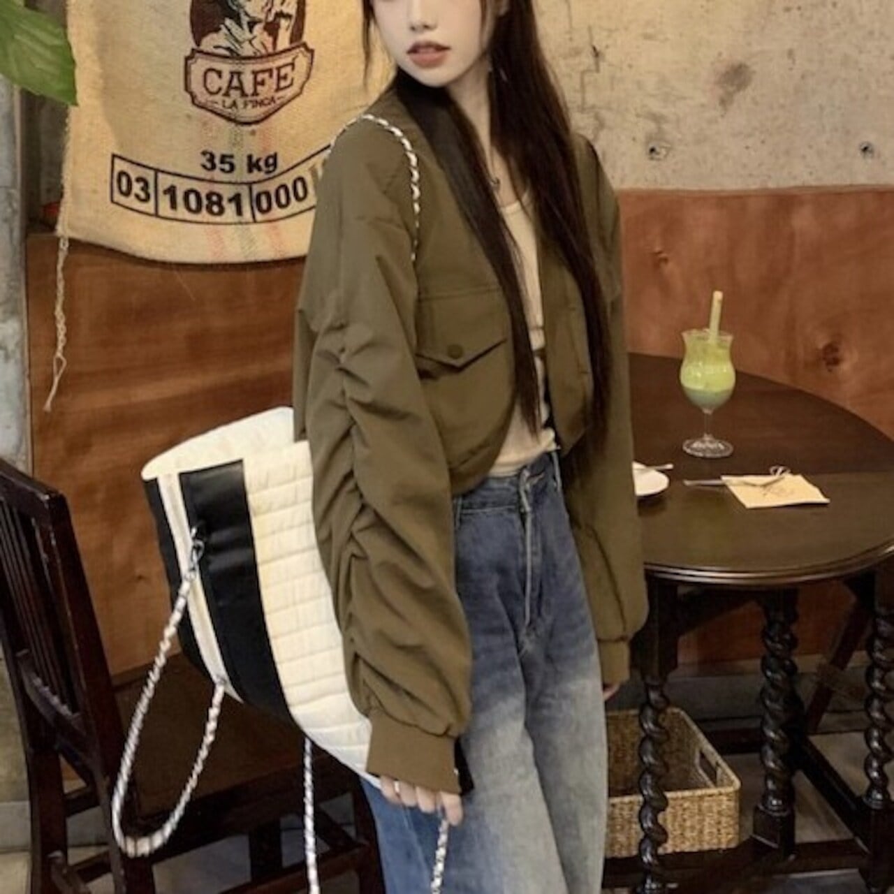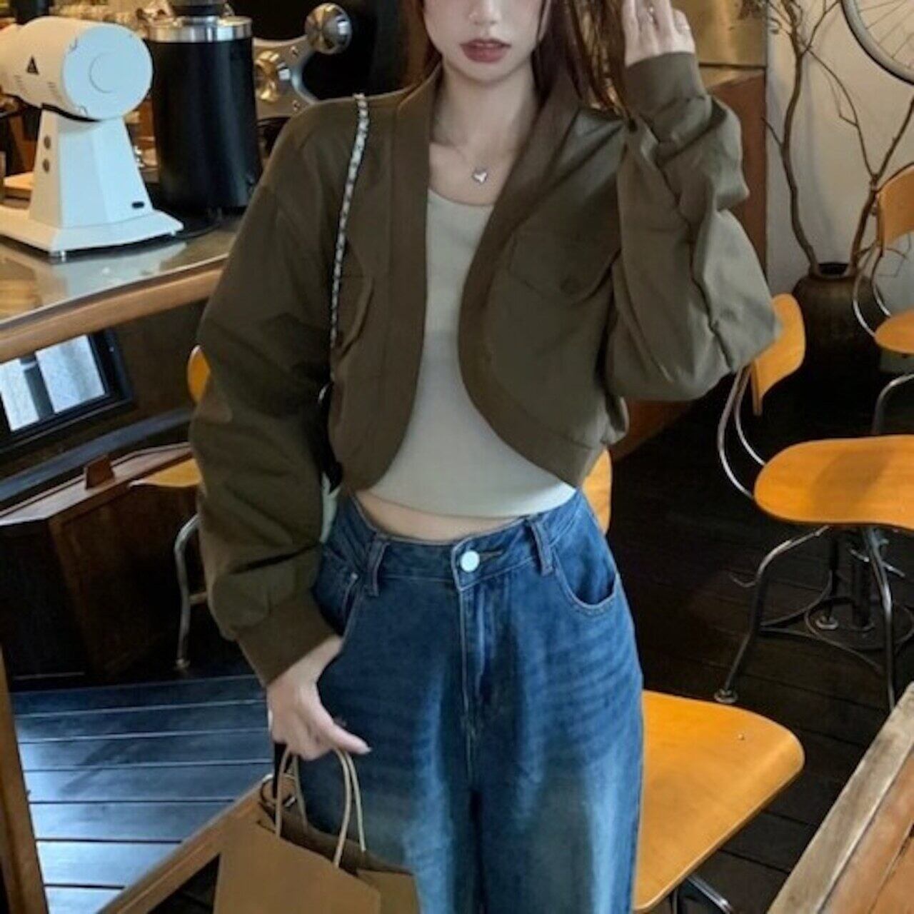 ✅カジュアル ガーリー E585ショート丈ブルゾン ジャケット ギャザースリーブ