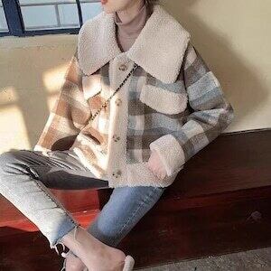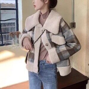 このコートの特徴は、その柔らかで暖かいボア素材。寒い季節には嬉しいアイテムです。また、チェック柄のデザインがトレンド感を演出し、おしゃれな印象を与えます。
