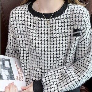千鳥格子柄のニットセーターには、魅力がたくさん詰まっています。ベーシックなデザインでありながら、千鳥格子柄がアクセントとなっており、カジュアルな着こなしにピッタリです。柄があるので、一枚でも主役級の存在感を放ちますよ。