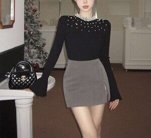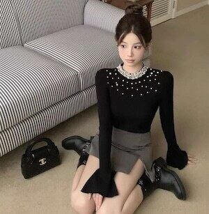✅ フレア袖パールデザインニット フレア袖 セーター エレガント デート E701